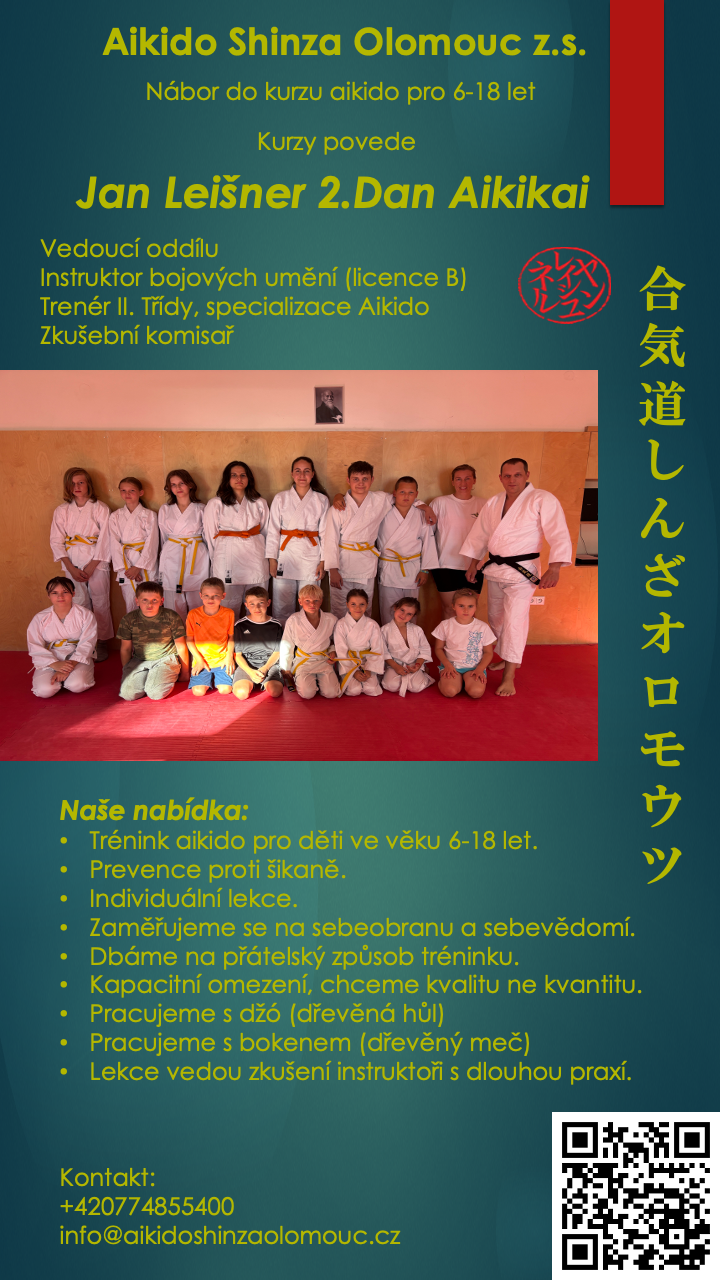 Naši instruktoři také ještě působí v oddílu Aikido Koloseum Šternberk , kde naši instruktoři vyučují jak děti tak i dospělé , máme mnoholetou zkušenost s tréninkem mládeže a dospělých , mezi naše dospělé členy patří členové Vazební Věznice v Olomouci , kterým zlepšujeme služební přípravu pro jejich výkon.
